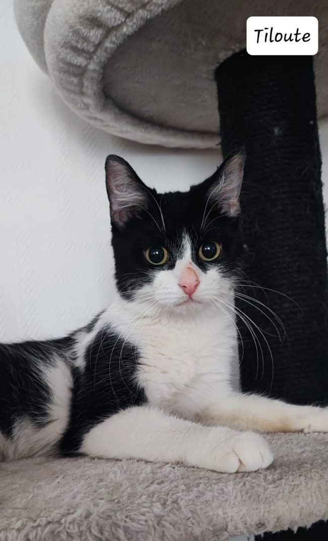 Tiloute, chatonne de 9 mois, très proche de l’homme. Affectueuse et caline. OK chat et enfant. ** Identifiée par puce électronique, vaccinée, déparasitée et stérilisée. ** Frais d’adoption : 230e