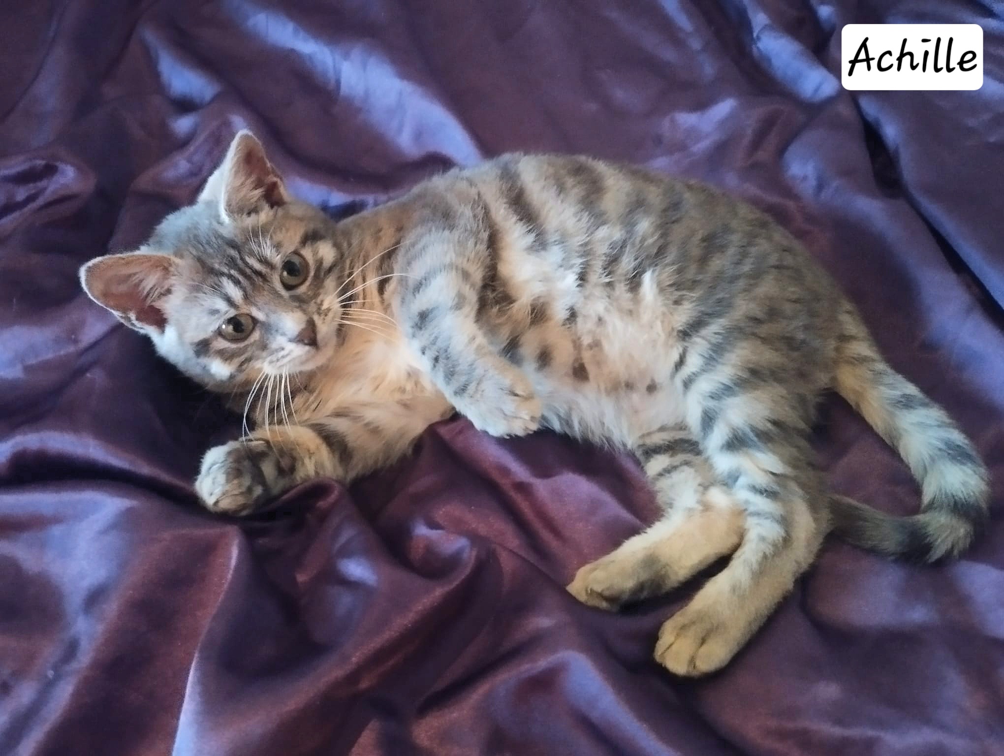 Achille, c’est un petit chaton de 3 mois très attachant. Il est calme et aura besoin d’adoptants patients. Une fois en confiance il apprécie les moments de jeux ( il est très joueur le soir et il se met en mode foufou dans le lit) il apprécie aussi les caresses, papouilles et se laisse complètement manipuler. C’est également un petit gourmand.