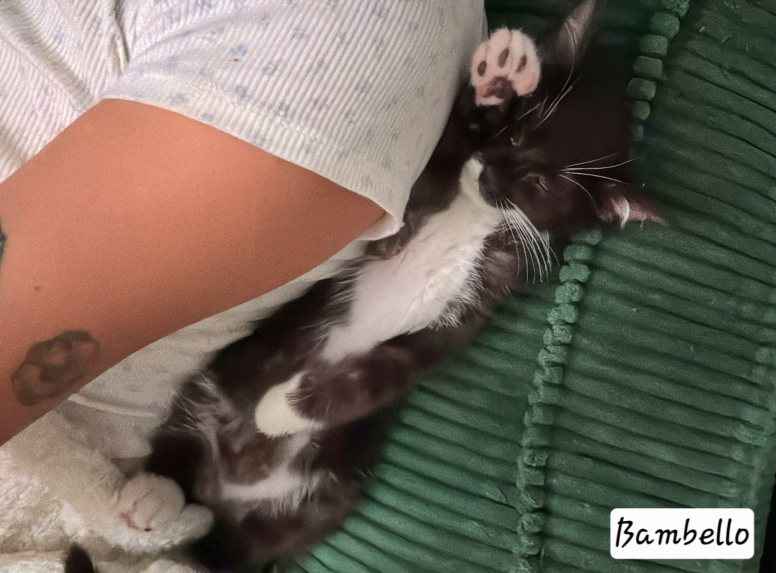 Bambello est un adorable chaton de 2.5 mois, au cœur fondant. Hyper câlin, il cherche sans cesse le contact et l’attention de l’humain. Il adore les caresses, ronronne à la moindre main tendue, et n’hésite pas à venir se blottir contre vous pour un moment de tendresse.