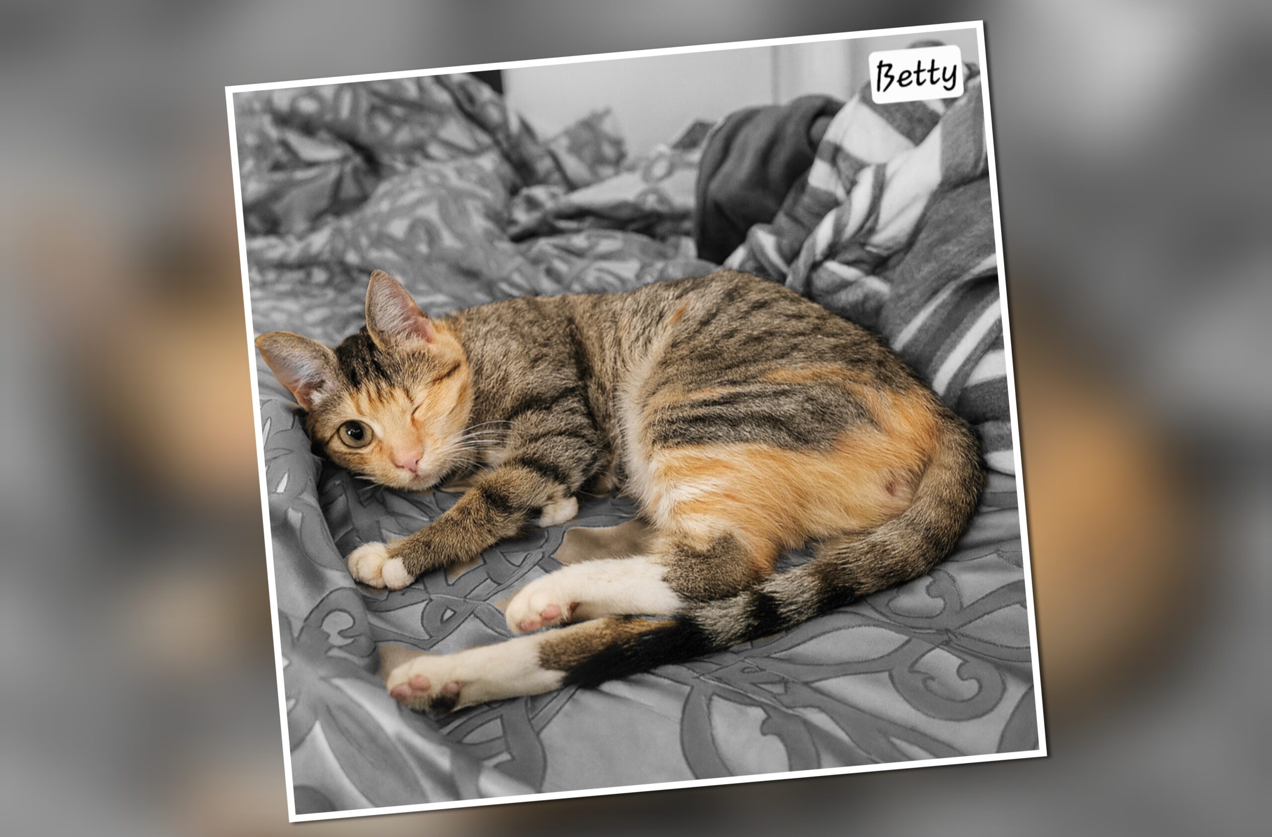 Betty est borgne, et souffre d’une allergie alimentaire très simple à gérer : elle tolère parfaitement la pâtée de la marque Lidl, ce qui facilite énormément son quotidien. Malgré sa petite différence, Betty est très agile et mène une vie de chatte totalement normale en intérieur. Elle joue, saute, explore et profite pleinement de la vie.