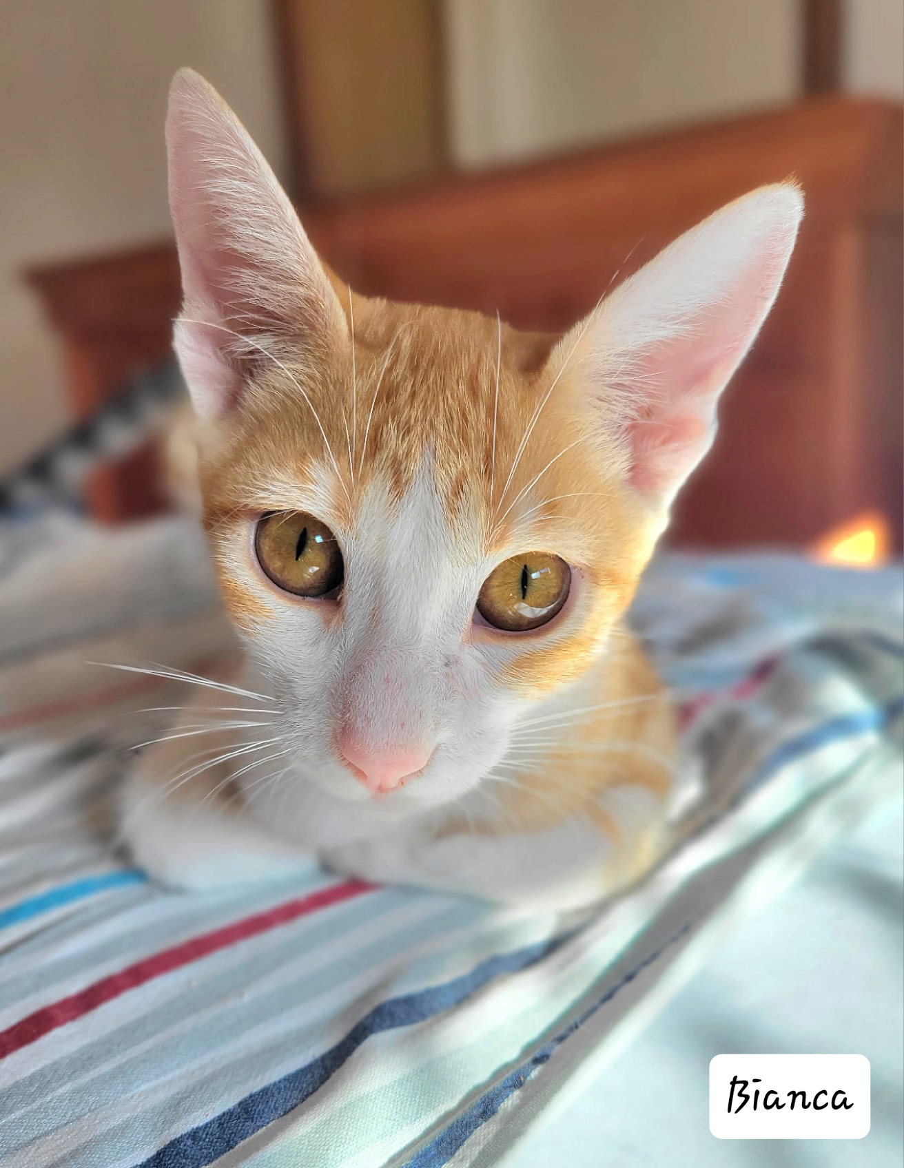 Bianca est une belle chatonne 4 mois. Son pelage roux et blanc est représentatif de son caractère, c’est le feu et la glace ensemble, Bianca est avenante, vive, joueuse, câline, elle ronronne dès qu’elle nous voit.