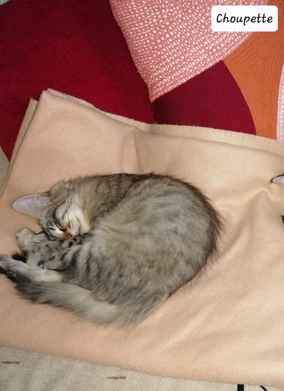 Choupette de 3 mois aux poils mi-longs, très sociable, très caline. Recherche la présence et les papouilles.