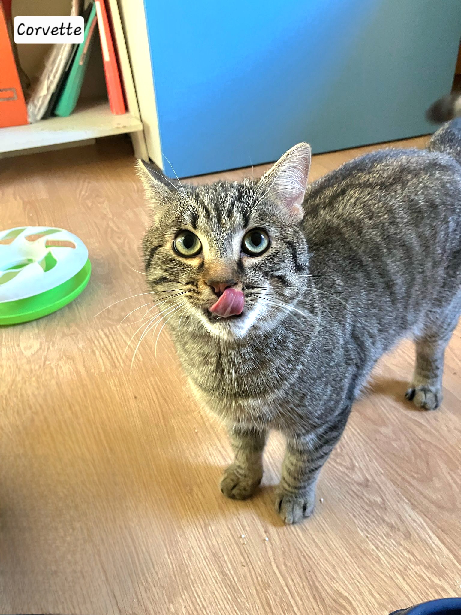 Corvette est un vrai pot de colle ! Ce jeune mâle de 11 mois est hyper câlin, très proche de l’humain et toujours en quête d’attention. Il adore venir se frotter, réclamer des caresses et vous suivre partout. Un vrai compagnon fusionnel qui fera fondre votre cœur.
