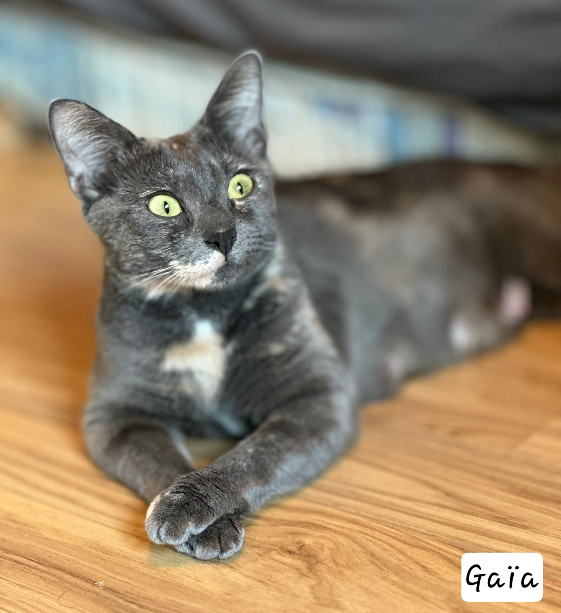 Gaïa est un amour de minette, elle a 2 ans. Elle est très affectueuse et adore les câlins, elle est rapidement à l’aise avec les gens et proche de l’homme.