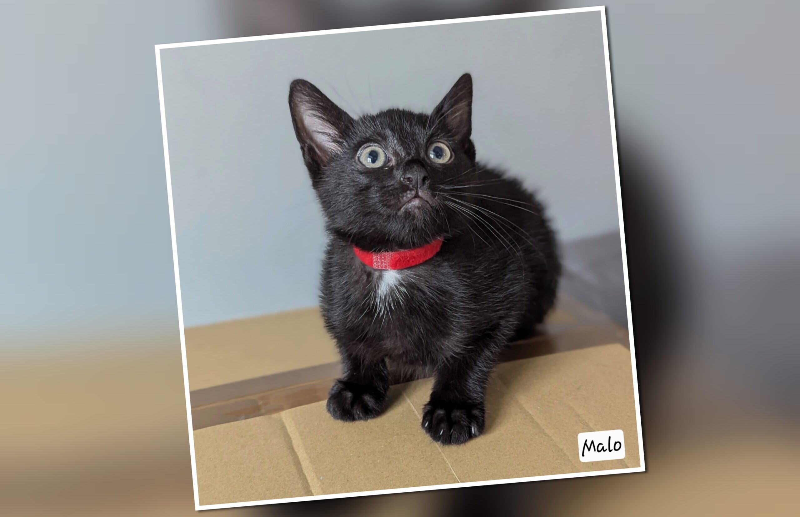 Malo est un gentil chaton au tempérament plutôt calme. Bavard, il adore se blottir sur les genoux pour faire sa sieste. Il apprécie particulièrement les parties de canne à pêche et les courses après les petites balles.