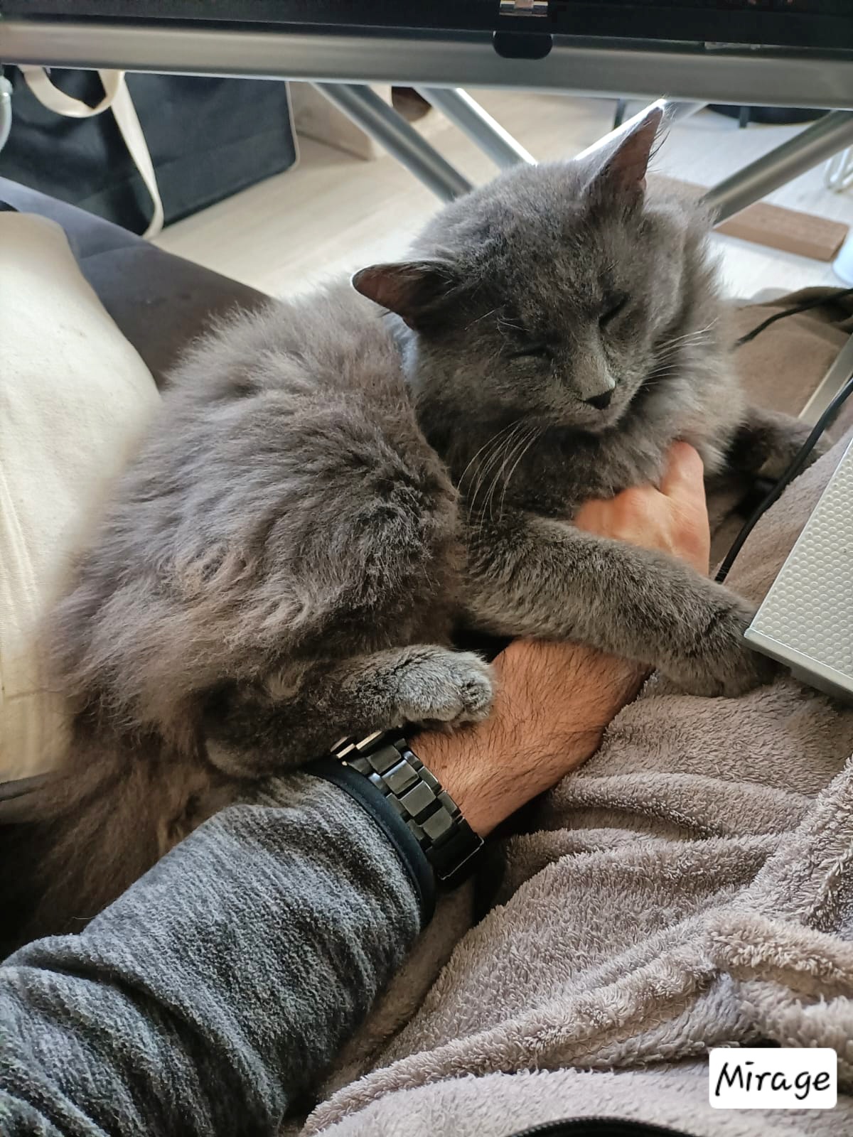 Mirage est de type chartreux aux poils mi-longs, âgé de 3 ans. C’est un amour de chat, une fois en confiance c’est un chat-chien qui vous suit partout et vous fera des câlins à n’en plus finir. Il est très très proche de l’homme.
