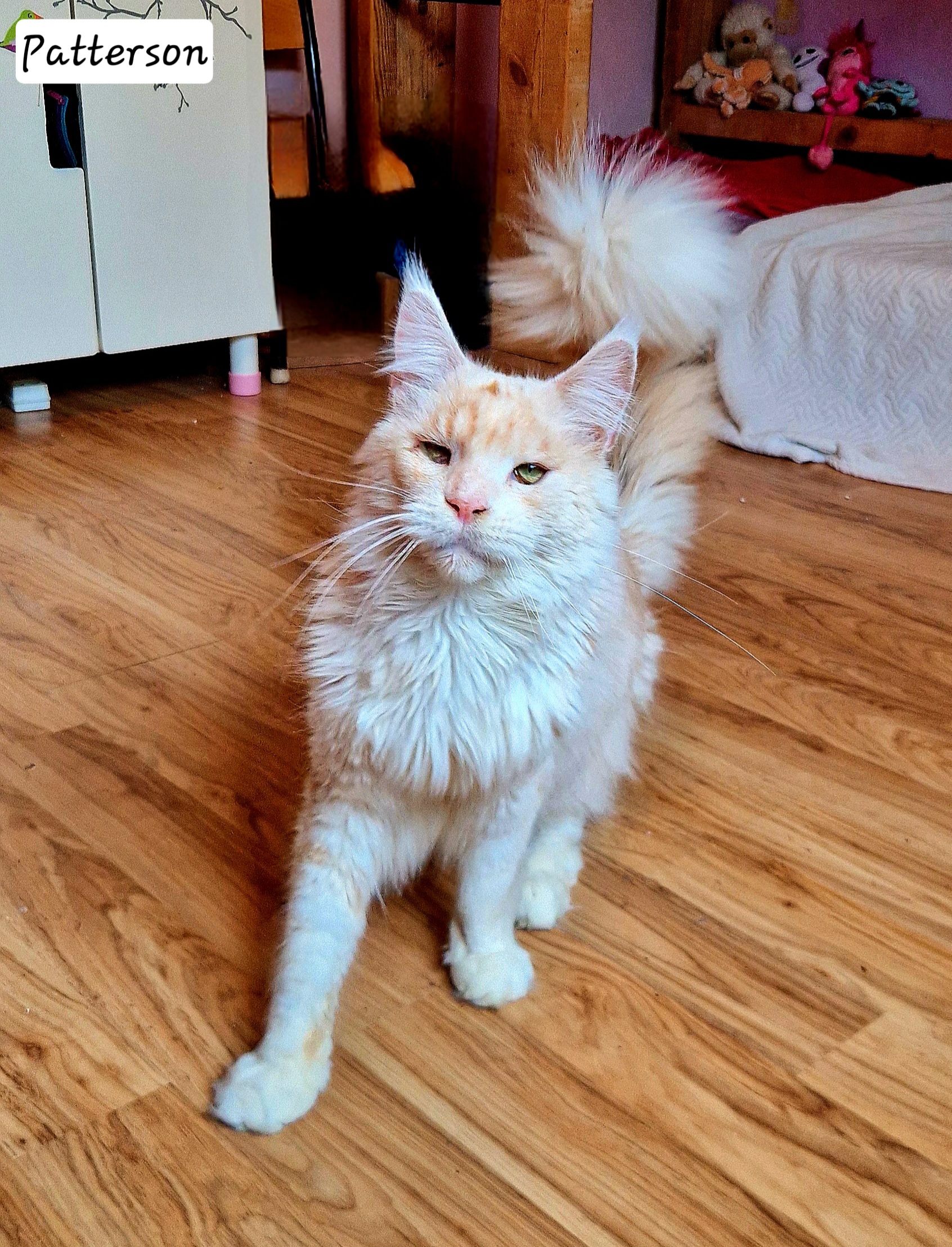 Patterson est un magnifique Maine coon LOOF de 5 ans, de couleur Red smoke, aux poils longs. Il est proche de l’homme et plutôt posé. Il aura besoin d’un environnement calme pour son épanouissement, une fois en confiance c’est un amour de chat qui ne demande qu’à être papouillé. Un brossage régulier est à prévoir du fait de son poil long.