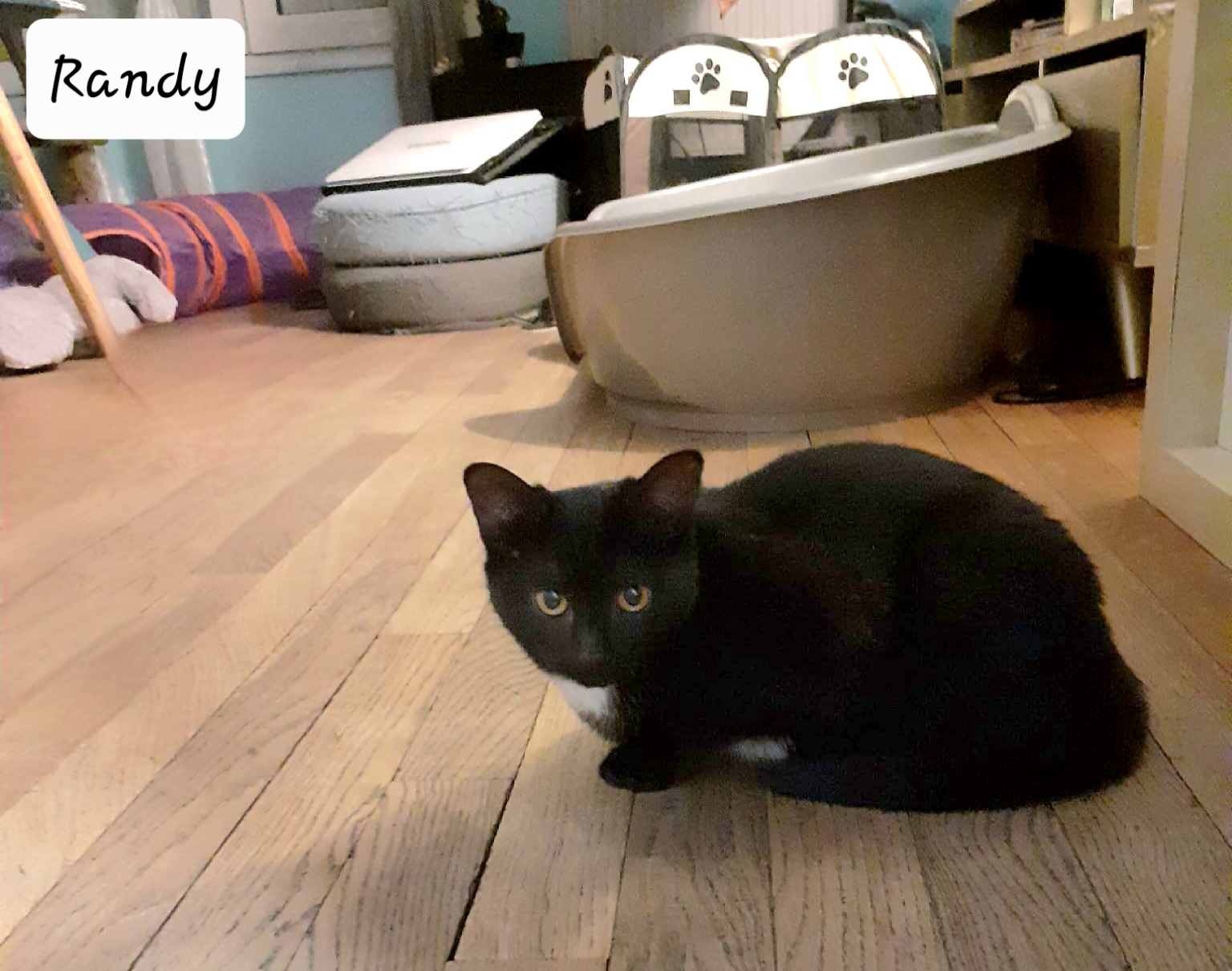 Chatonne de 6 mois, noire avec médaillon blanc, un vrai petit nounours.