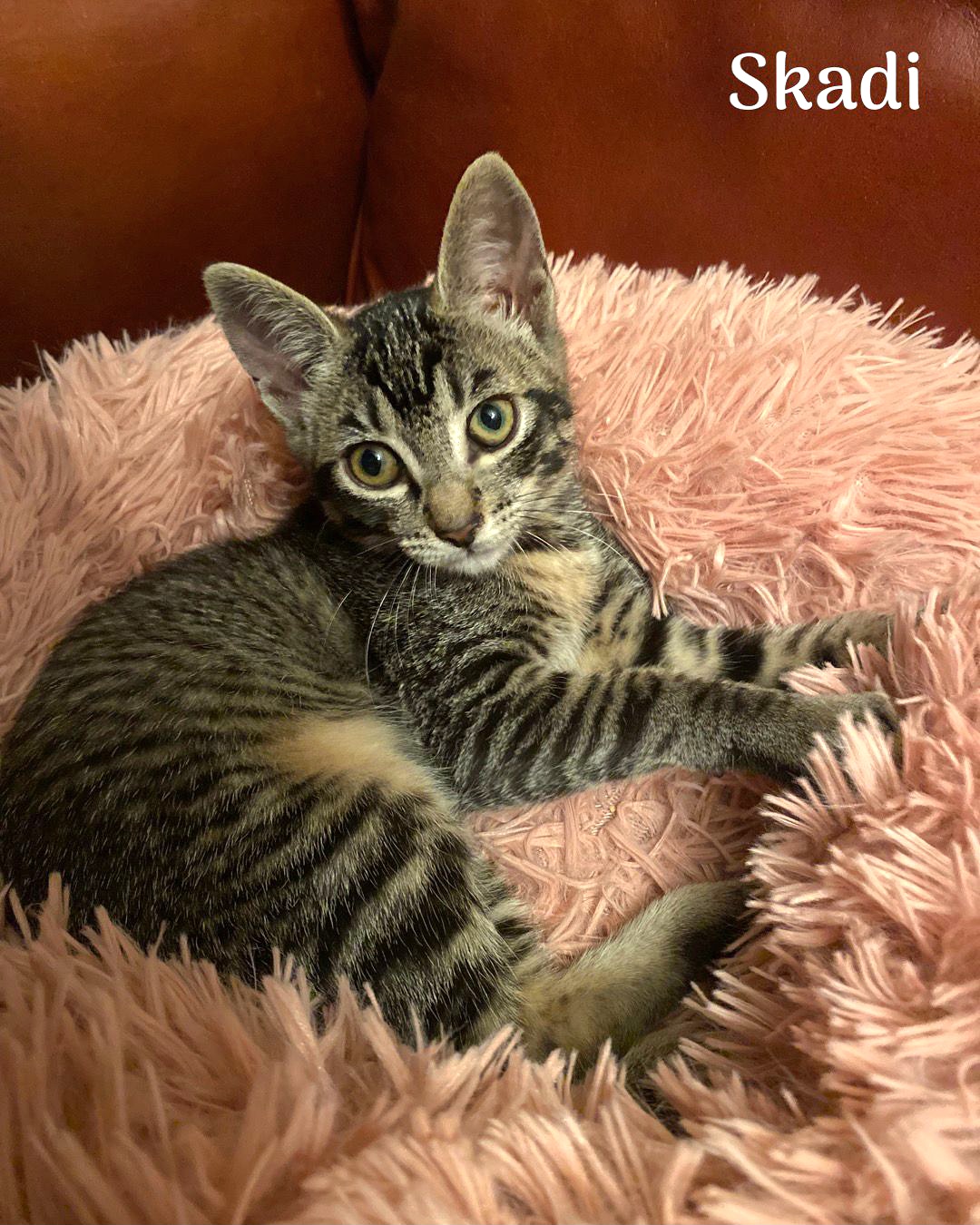 Skadi est une amour de chatonne de 3 mois, sensible, sociable, proche de l’humain, curieuse, très joueuse et câline (elle vous rend vos caresses avec ses pattes de velours et vous léchouille le visage pendant les moments câlins) ! Elle est aussi très drôle lorsqu’elle est hyper joyeuse : elle sautille et se met debout tel un petit suricate.