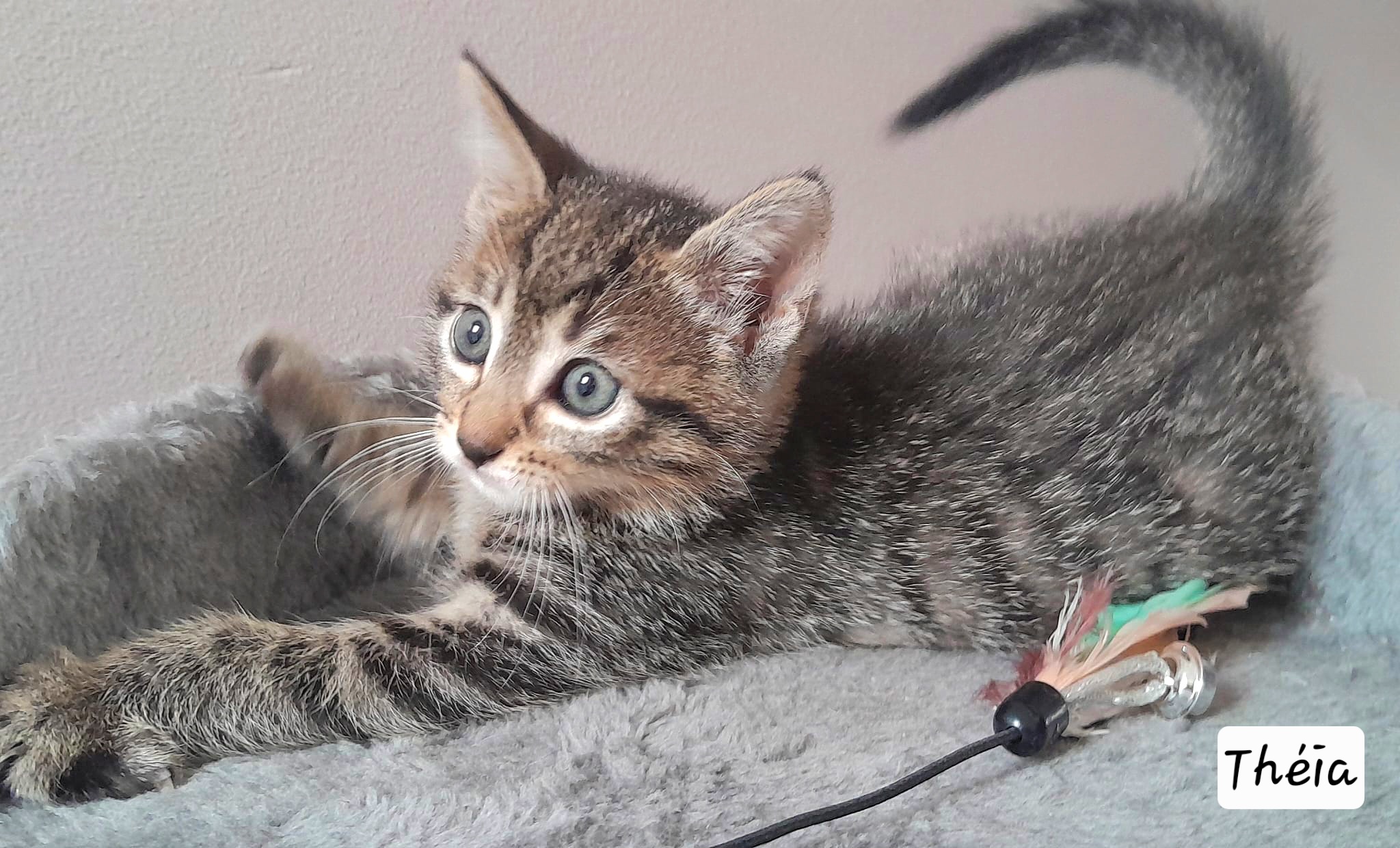 Théia, 2 mois, est une adorable chatonne pleine de tendresse et de vie. Très câline, affectueuse et proche de l’humain, elle s’entend aussi parfaitement avec les autres chats.