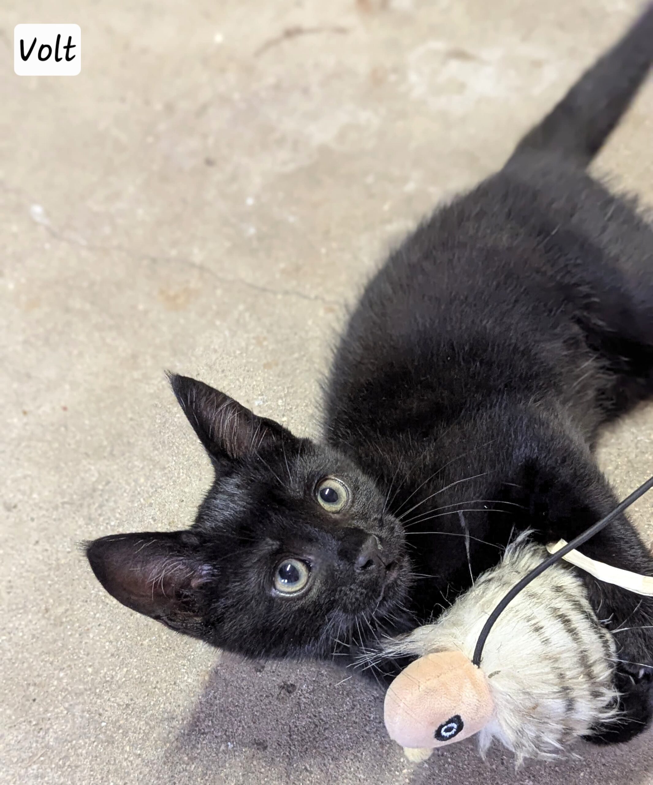 Volt est un chaton de deux mois et demi, plein de vie et toujours partant pour jouer !Toujours en recherche de contact avec les humains, il accourt dès que vous entrez dans la pièce. Avec son tempérament « chat-chien », Volt vous suit partout et vous fait comprendre qu’il a envie de câlins et de jeux.Sa tache rousse sur la nuque lui donne un look unique et rigolo.