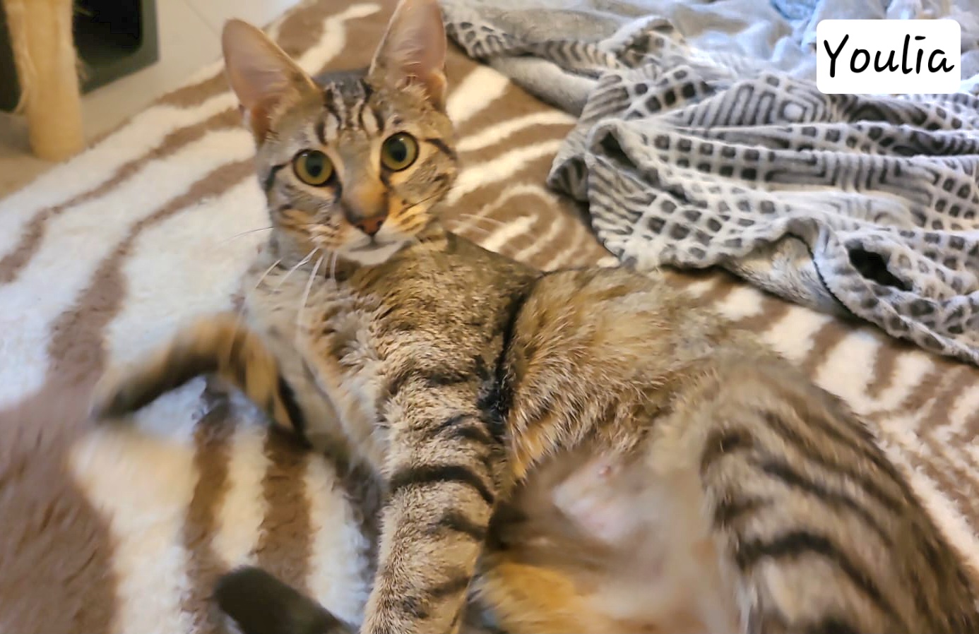 Youlia est une chatonne de 8 mois, c’est un amour, elle demande énormément de câlins et caresses, elle est joueuse et gourmande en plus. Youlia est rapidement à l’aise avec les gens et très proche de l’homme.