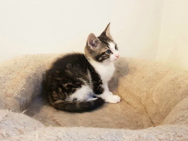 Chaton mâle de 3 mois, tigré et blanc. Adoption double possible avec son frère Cookie. ✅ Partira identifié par puce électronique, primo-vacciné, déparasité, vermifugé